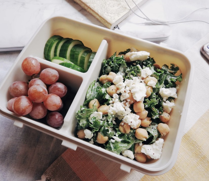 - Formula: Dressing on the bottom + Hard Veggies/Grains + Protein + Softer Veggies/Fruits + Greens on top.